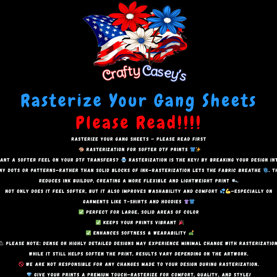 💡♀️Note: We are not responsible for how you line up your gang sheet. We are also not responsible for your colors. As digitally on a computer the colors will never match up completely. DTF is printed in CMYK, not RGB as for computers. We do our best to get them as close as possible. 💡